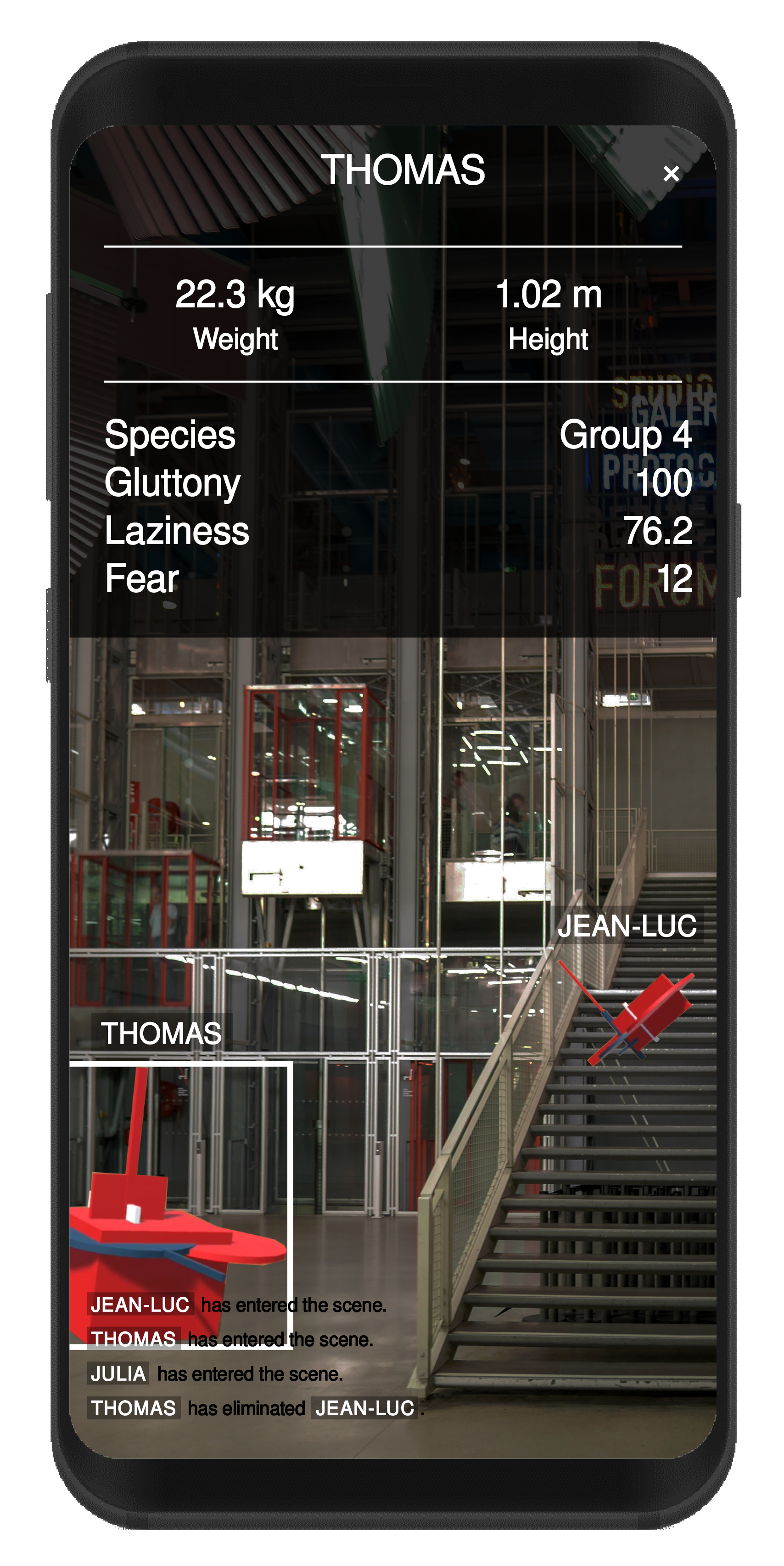 Simulated AR View in landscape. We have Prouns, names anchored to them, and a world broadcast feed visible in the bottom-left.