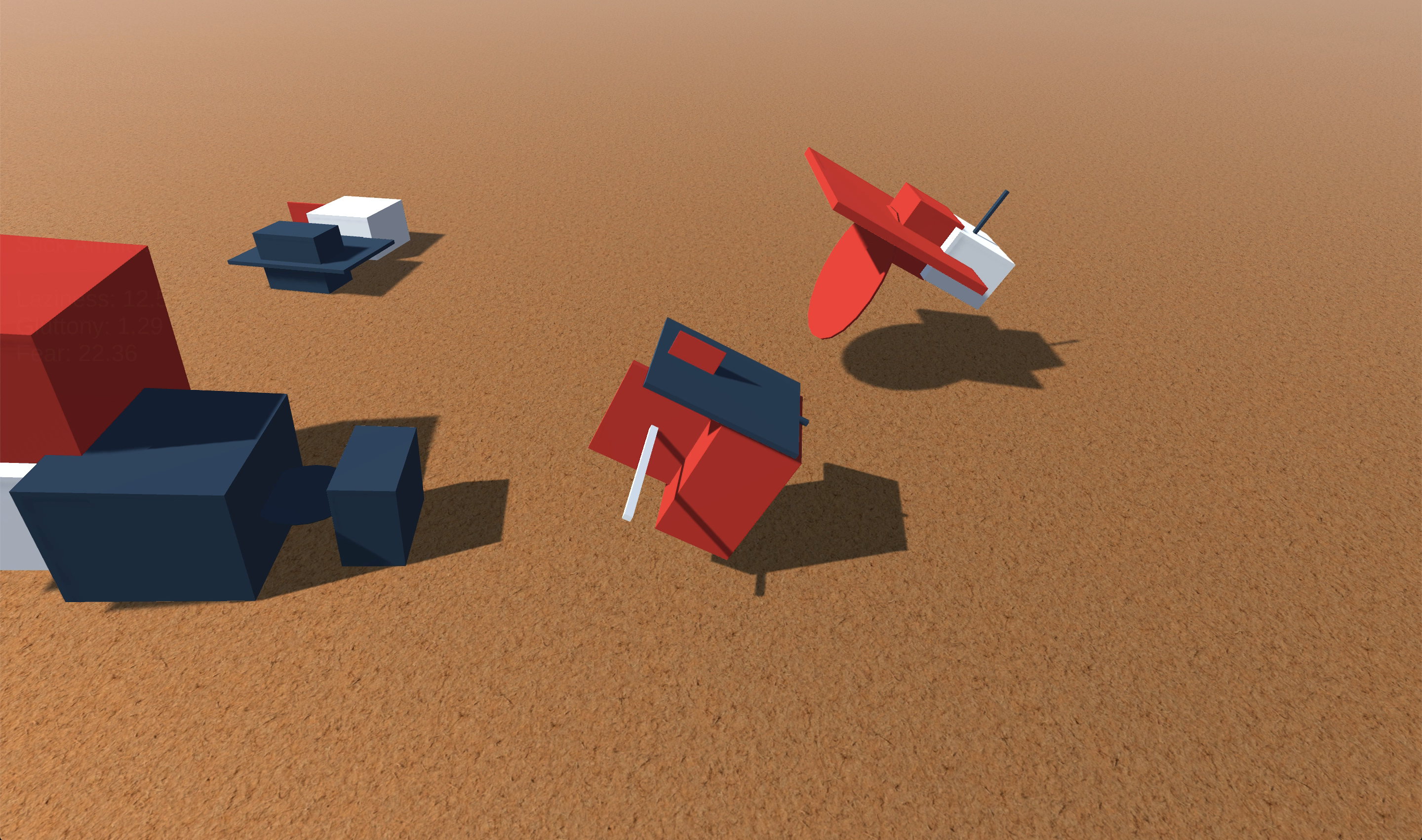 Each Proun is made up of a some combination of the following shapes: Circle, Box, Plane, Stick. Each shape can be considered as a sort of limb. These limbs are able to transform transform laterally (x, y, z). While limbs do not bend, flex, or rotate. These transformations generate momentum and allow the Prouns to move around or jump.